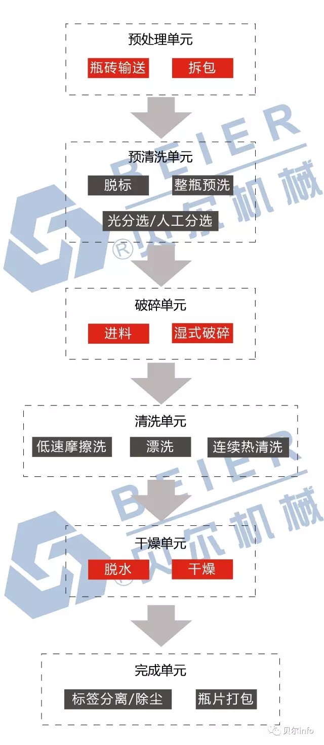 回收的PET塑料瓶,首先經(jīng)過"脫標(biāo)機(jī)"去除瓶身的標(biāo)簽,然后經(jīng)過"平面分選輸送機(jī)",在此步驟挑選出物料中的雜色瓶(如綠色瓶、藍(lán)色瓶、殘余雜質(zhì)等),再進(jìn)入"破碎機(jī)"進(jìn)行粉碎,出來后進(jìn)入"漂洗水槽"進(jìn)行分離(實(shí)現(xiàn)PET瓶片與PP標(biāo)簽紙、瓶蓋的分離),分離干凈后進(jìn)入"熱清洗單元"進(jìn)行加熱清洗,出來后再進(jìn)入"漂洗水槽"進(jìn)行漂洗(去除高溫加熱中的清洗劑),最后進(jìn)入"脫水機(jī)"脫水后直接裝包。針對產(chǎn)量大、瓶片級別高我們可通過整瓶預(yù)洗環(huán)節(jié)、脫標(biāo)分揀環(huán)節(jié)、初碎環(huán)節(jié)、初洗分離環(huán)節(jié)、高溫清洗環(huán)節(jié)、中和清洗環(huán)節(jié)、漂洗干燥環(huán)節(jié)、瓶片精選環(huán)節(jié)等整套精洗環(huán)節(jié)來達(dá)到高精凈片。此流程為常規(guī)流程,亦可根據(jù)客戶需要設(shè)計不同生產(chǎn)解決方案。
