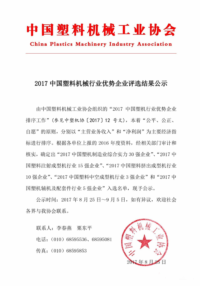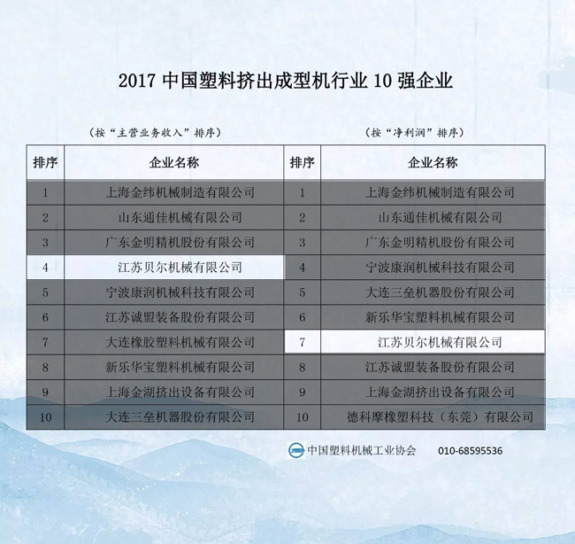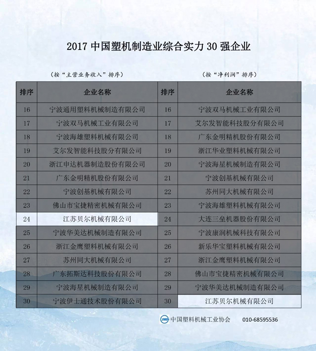 2017中國塑料機(jī)械行業(yè)優(yōu)勢企業(yè)的排名公示,江蘇貝爾機(jī)械榮獲中國擠出成型機(jī)行業(yè)前4強(qiáng),塑機(jī)行業(yè)前24強(qiáng)榮譽(yù)稱號!