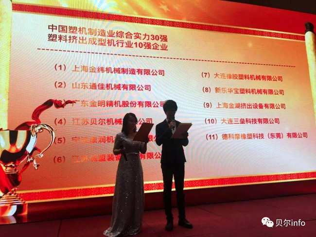 江蘇貝爾機械作為中國塑料機械工業(yè)協(xié)會副會長單位受邀參加此次論壇。論壇中,江蘇貝爾機械榮獲"2017年度中國塑料機械行業(yè)綜合實力30強、塑料擠出成型機10強"稱號。